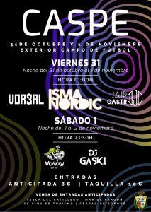 La concejalía de Festejos del Ayuntamiento de Caspe organiza actuaciones musicales en la carpa instalada en el exterior del Campo de Fútbol Municipal (C/ Constitución s/n) durante las noches del viernes 31 de octubre y el sábado 1 de noviembre.