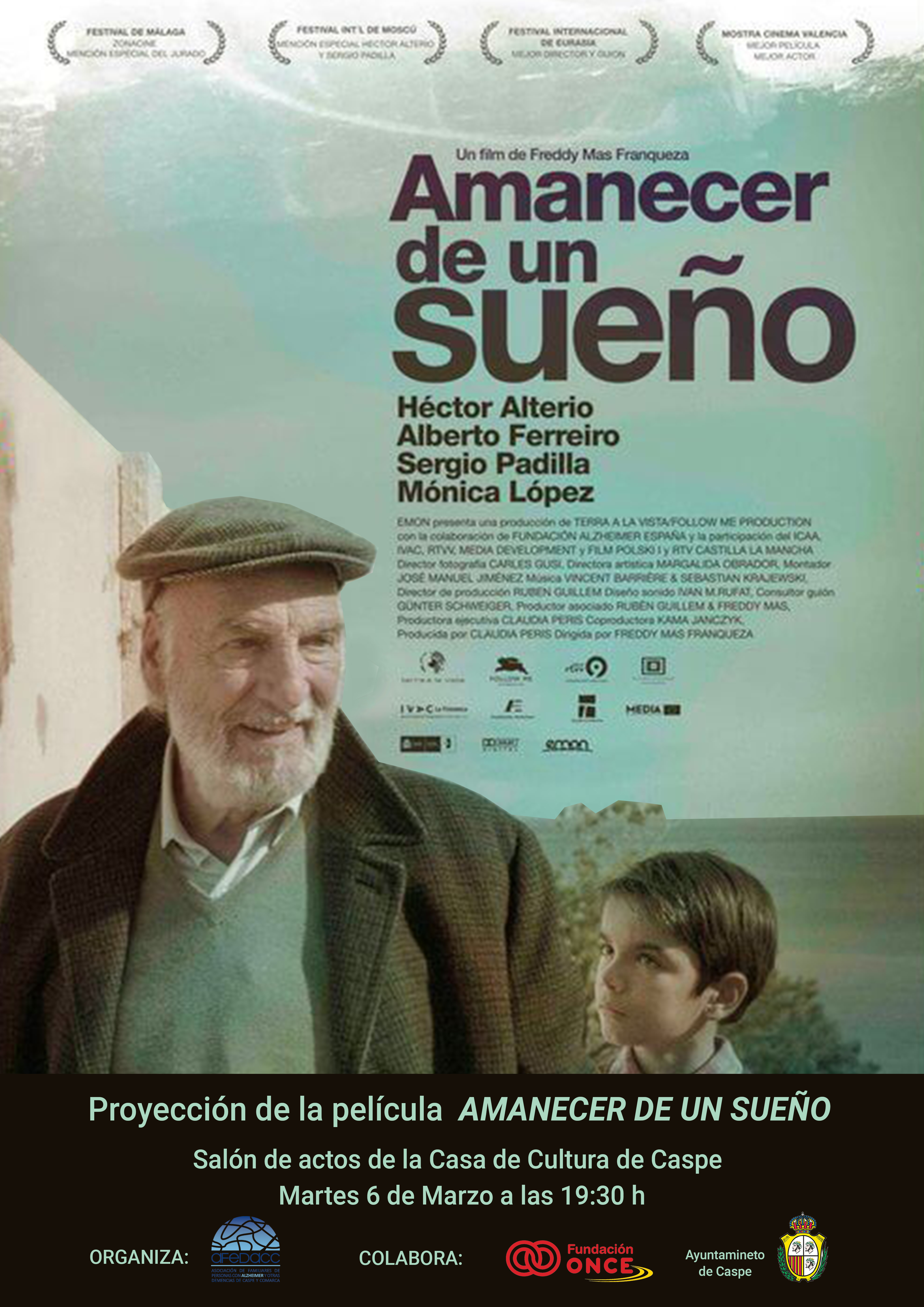 El próximo martes 6 de Marzo a las 19:30 horas, en el salón de actos de la Casa de Cultura de Caspe, se proyectara la película AMANECER DE UN SUEÑO. Es la ópera prima del director valenciano Freddy Mas Franqueza, inspirada en la historia personal que vivió con su abuelo.