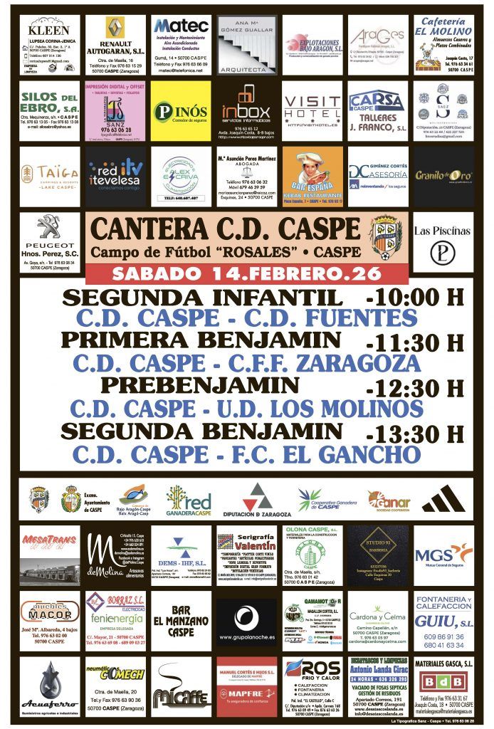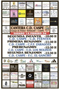 - Fútbol C.D. Caspe B. El sábado 14 de febrero a las 16:30 horas en el Campo Municipal de Fútbol Rosales. Primera Regional Grupo IV. D. Caspe B – C. D. Utrillas B.