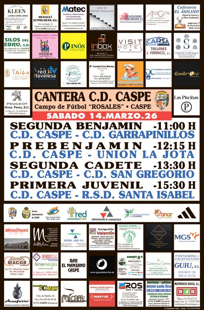 - Fútbol Cantera C.D. Caspe. El sábado 14 de marzo a partir de las 11:00 horas en el Campo de Fútbol Rosales.