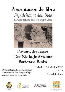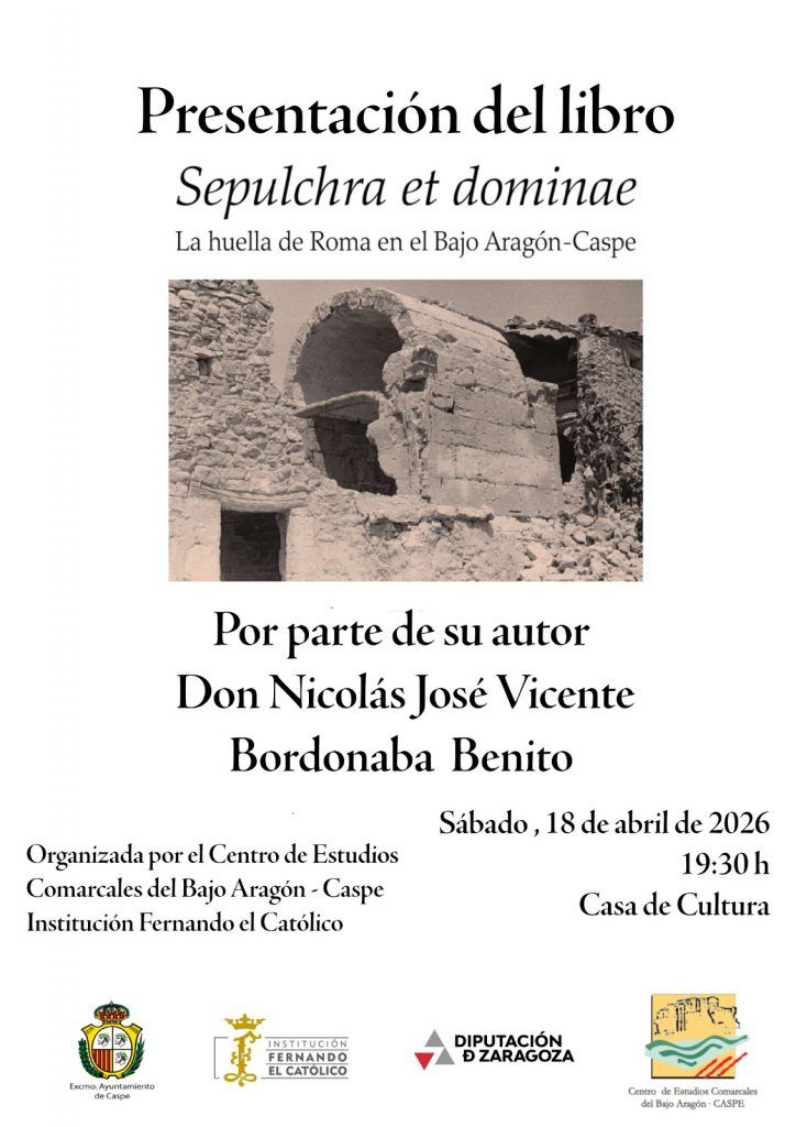 - Presentación del libro “Sepulchra et domine. La huella del Roma en el Bajo Aragón”. El sábado 18 de abril a las 19:30 horas en el salón de actos de la Casa de Cultura. Presentación a cargo del autor D. Nicolás José Vicente Bordonaba Benito. Organiza el Centro de Estudios Comarcales Del Bajo Aragón Caspe (CECBAC). Institución Fernando el Católico.