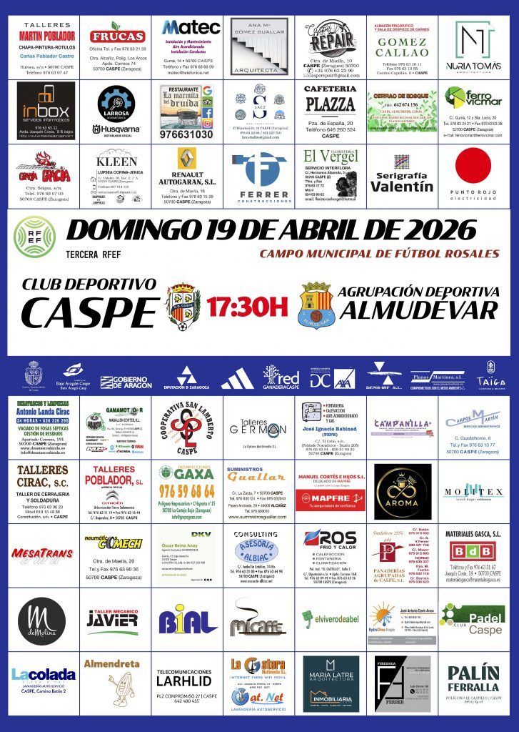 - Fútbol C.D. Caspe. El domingo 19 abril a las 17:30 horas en el Campo Municipal de Fútbol Rosales. Tercera RFEF. C.D. Caspe – A. D. Almudevar.