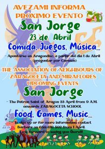 - AVEZAMI informa: Comida Día de San Jorge en Zaragoceta. El jueves 23 de abril a partir de las 9.00 horas en Zaragoceta: comida, juegos y música. ¡Apúntate en ARAGONDIC! Preguntar por Carmen.