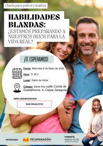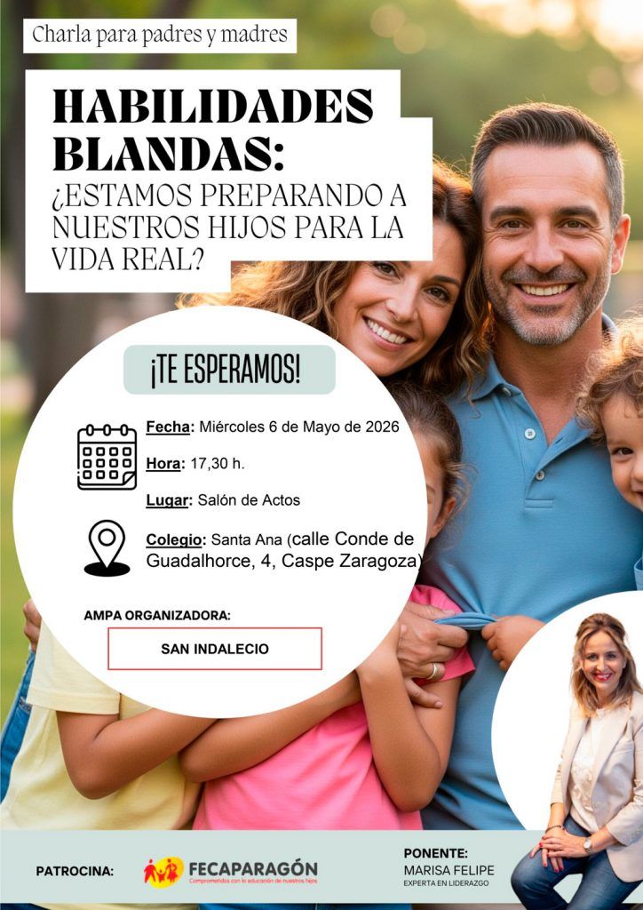 - Habilidades blandas: ¿Estamos preparando a nuestros hijos para la vida real? El miércoles 6 de mayo de 17:30 horas en el Salón de Actos del Colegio Santa Ana (entrada por C/ Conde de Guadalhorce,4). Charla para padres y madres, organiza AMPA San Indalecio. Ponente: Marisa Felipe, experta en liderazgo. ¡Te esperamos!