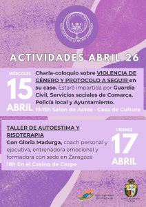 - Charla-coloquio sobre “Violencia de Género y Protocolo a Seguir en su caso”. El miércoles 15 de abril a la 19:30 horas en el salón de actos de la Casa de Cultura. Organizada por la Asociación de la Mujer Caspolina en colaboración con el Ayuntamiento de Caspe y la Comarca B.A.C. Estará impartida por Guardia Civil, Servicios Sociales de Comarca, Policía Local y Ayuntamiento. Una propuesta para conocer, prevenir, cuidarnos y reforzarnos como sociedad. Porque la información protege.