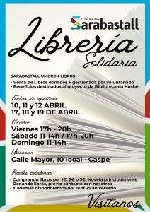 - La Fundación Sarabastall instala por primera vez su Librería Solidaria: Sarabastall Umbrok libros. Estará ubicada en Calle Mayor, 10 de Caspe. Un espacio en el que cada libro tiene mucho más que una historia. Se pondrán a la venta libros donados y gestionados de forma voluntaria, cuyos beneficios irán destinado al proyecto Biblioteca en Hushé. Disponibles los días 17, 18 y 19 de abril. Horario de apertura: