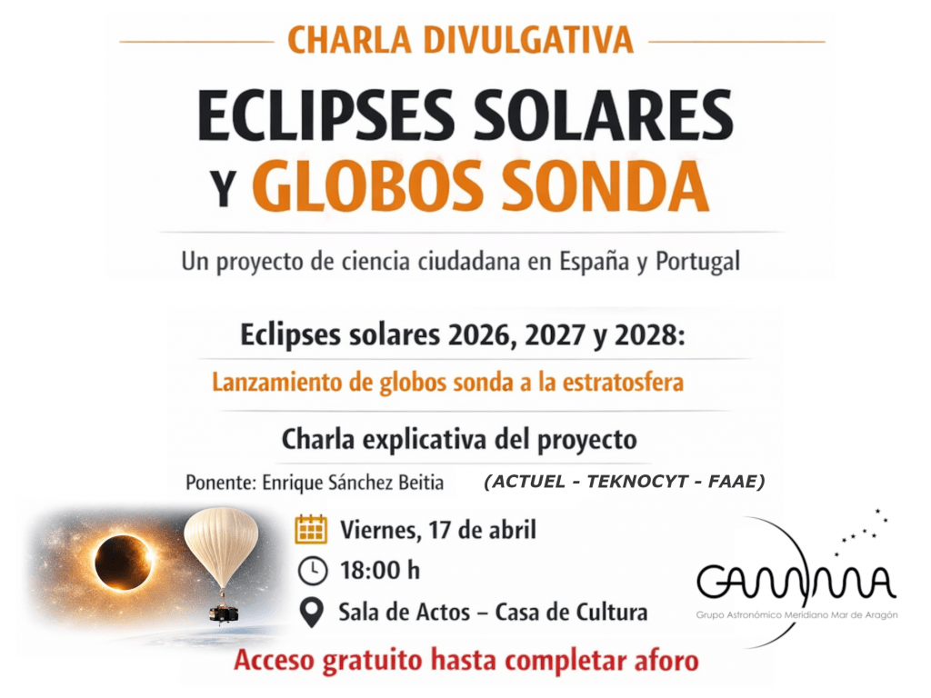 - Charla divulgativa “Eclipses Solares y Globos Sonda”. El viernes 17 de abril a las 18:00 horas en el salón de actos de la Casa de Cultura. Charla divulgativa organizada por la asociación Gamma Grupo Astronómico Meridiano Mar de Aragón. Un proyecto de ciencia ciudadana en España y Portugal. Eclipses solares 2026, 2027 y 2028. Acceso gratuito hasta completar aforo.