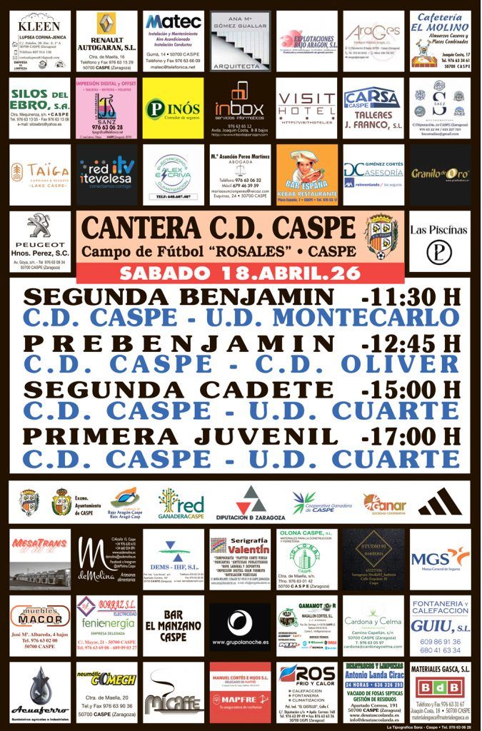 - Fútbol Cantera C.D. Caspe. El sábado 18 de abril a partir de las 11:30 horas en el Campo de Fútbol Rosales.