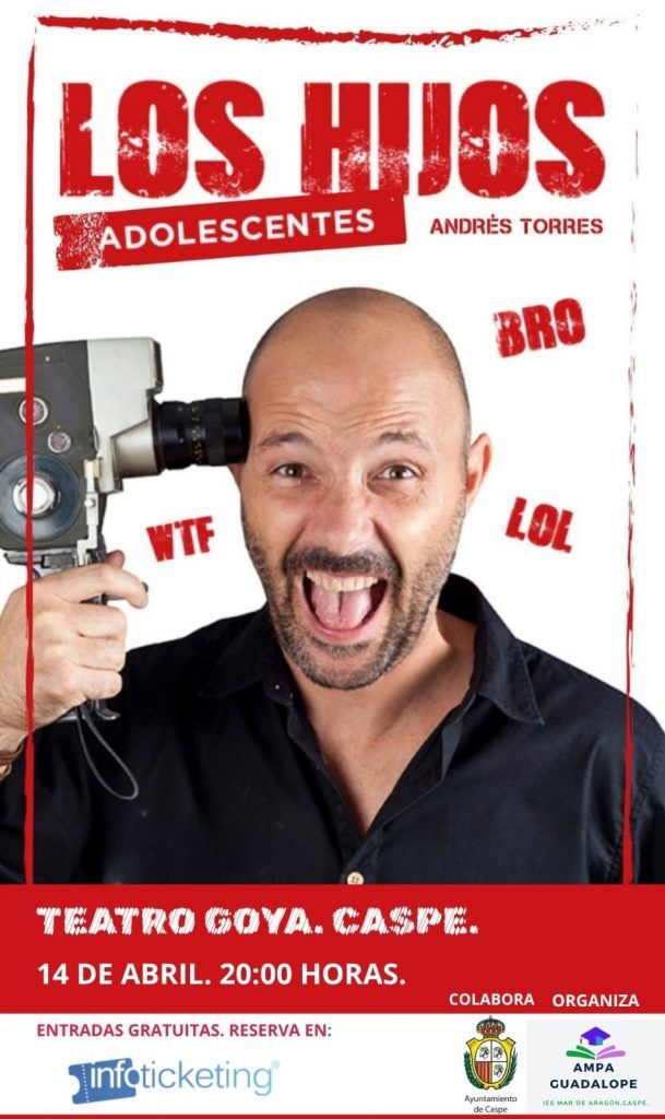 - I edición Jornadas “Adolescencia en positivo”. El martes 14 de abril a las 20:00 horas en el Teatro Goya, se celebra la primera actividad de las jornadas organizadas por el AMPA Guadalope del IES Mar de Aragón. En esta ocasión se trata de la comedia familiar de monólogos sobre adolescencia “Los hijos adolescentes” a cargo de Andrés Torres. El evento es gratuito, entrada anticipada en: https://caspe.sacatuentrada.es/es/entradas/los-hijos-adolescentes