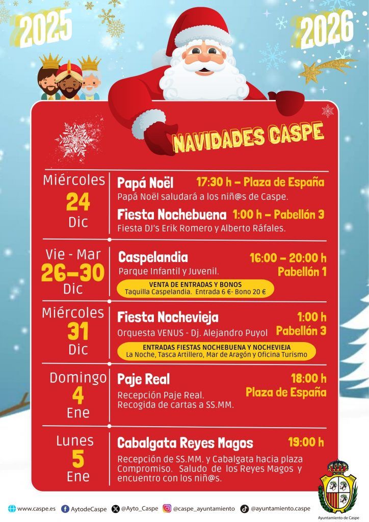 - Cabalgata de Reyes. El lunes 5 de enero de 2026 a las 19:00 horas recepción a SS.MM en la plaza Aragón y Cabalgata hacia la Plaza Compromiso. Saludo de los Reyes Magos y encuentro con l@s niñ@s de Caspe.
