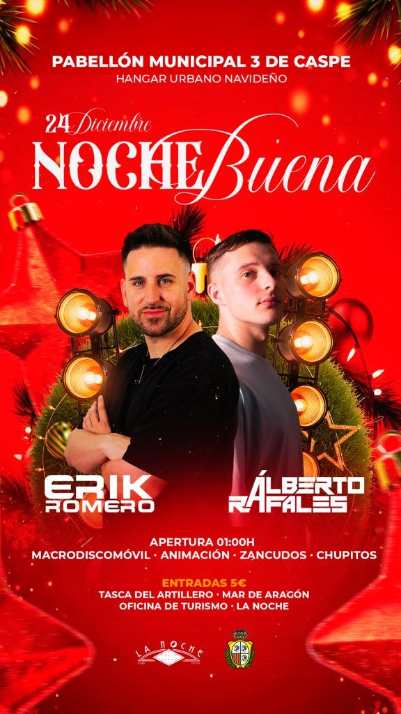 - Fiesta de Nochebuena. El miércoles 24 de diciembre a partir de la 1:00 horas en el Pabellón 3 (Pista de baloncesto). Fiesta Hangar Urbano Navideño con los Djs Erik Romero y Alberto Ráfales. Entradas a 5€. Puedes encontrarlas en La Noche, Bar Tasca del Artillero, Cafetería Mar de Aragón, Oficina de Turismo de Caspe y en la taquilla el día del evento.