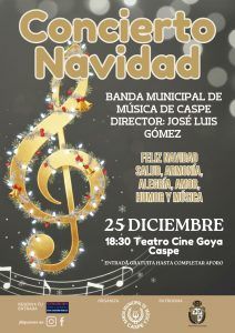 - Concierto Navidad de la Banda Municipal de Música de Caspe. El jueves 25 de diciembre a las 18:30 horas en el Teatro Goya. Entrada gratuita hasta completar aforo. Consigue tus entradas en https://caspe.sacatuentrada.es