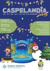 - Desde el viernes 26 al martes 30 de diciembre de 16:00 a 20:00 horas en el Pabellón Municipal número 1 de Caspe. Entradas 6€ y Bonos 20€ para 5 días se pueden adquirir en la taquilla de Caspelandia.