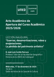 - Apertura Curso Académico UNED 2025-2026- El miércoles 17 de diciembre a las 17:30 horas en el Salón de Actos de la Casa de la Cultura. Lección inaugural “Guerras, desamortizaciones, robos y enajenaciones. La pérdida del patrimonio artístico” a cargo del profesor Tutor de la Facultad de Geografía e Historia de Calatayud, D. José Luis Cortes Perruca.