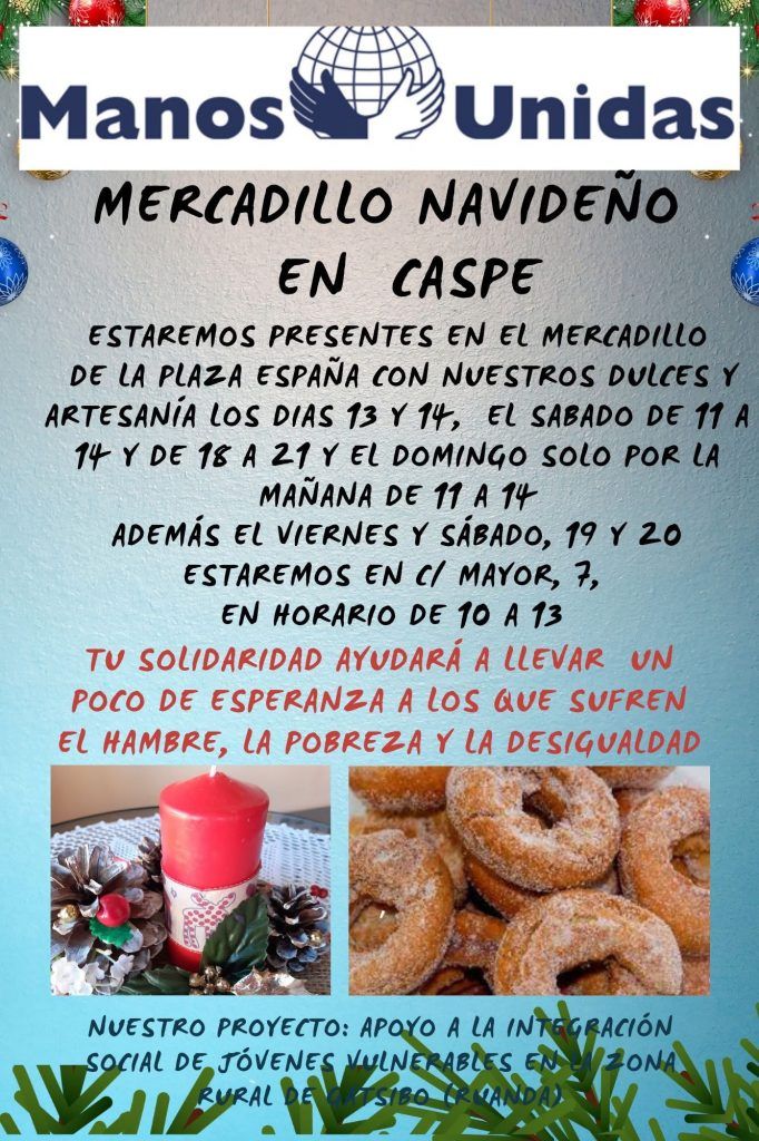 - Mercadillo Navideño de Manos Unidas. El sábado 20 y el domingo 21 de diciembre en calle Mayor, 7 de Caspe en horario de10:00 a 13:00 horas.