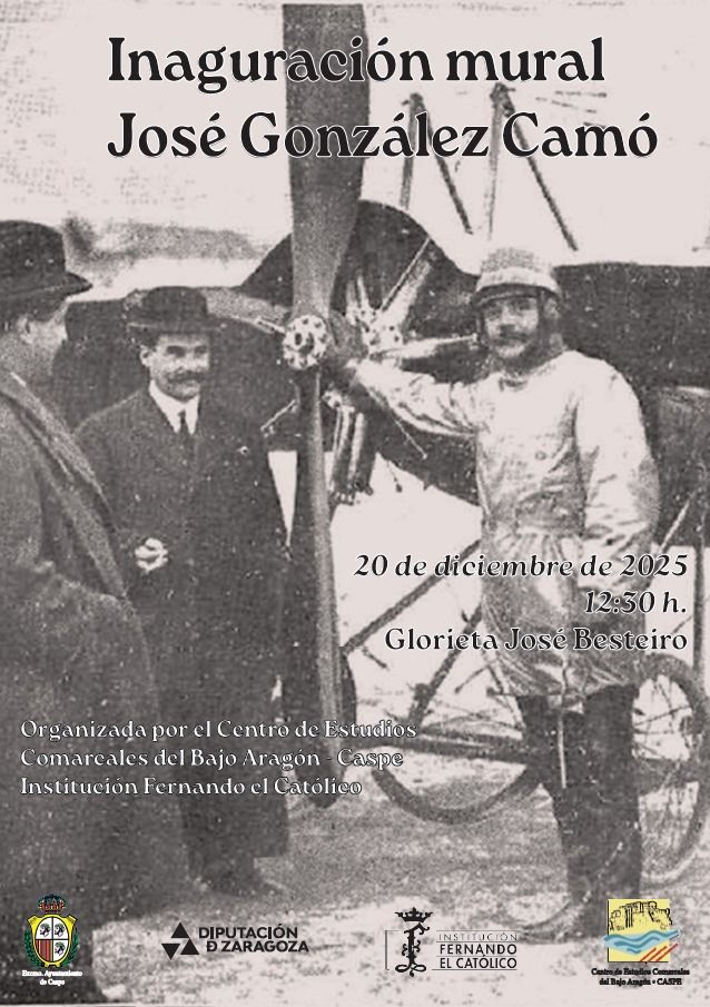 - Inauguración mural José González Camó- El sábado 20 de diciembre a las 12:30 horas en la Glorieta Besteiro, organizado por CECBAC, Institución Fernando el Católico en colaboración con el Ayuntamiento de Caspe y la Diputación Provincial de Zaragoza. Acto dedicado a González Camó, caspolino y militar del arma de caballería, que hizo historia al convertirse en el primer piloto que sobrevoló con un avión a motor la ciudad de Madrid.