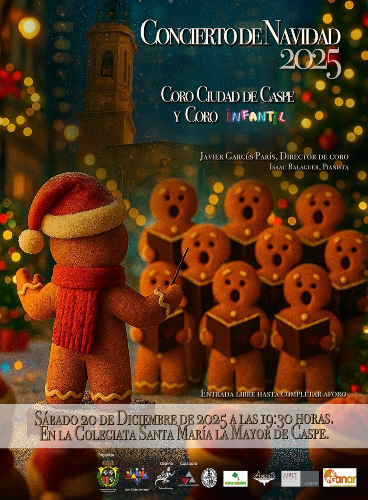 - Concierto Navidad 2025. Coro Ciudad de Caspe y Coro Infantil. El sábado 20 de diciembre a las 19:30 horas en la Colegiata Santa María La Mayor de Caspe. Organiza Ayuntamiento de Caspe y Coro Ciudad de Caspe. Entrada gratuita hasta completar aforo.