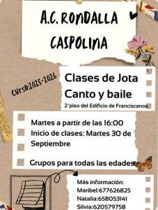 - Clases de Jota, Canto y Baile. C. Rondalla Caspolina. Curso 2025-2026. Inicio de clases los martes a partir del 30 de septiembre a las 16:00 horas. Grupos de todas las edades. Más información teléfonos:
