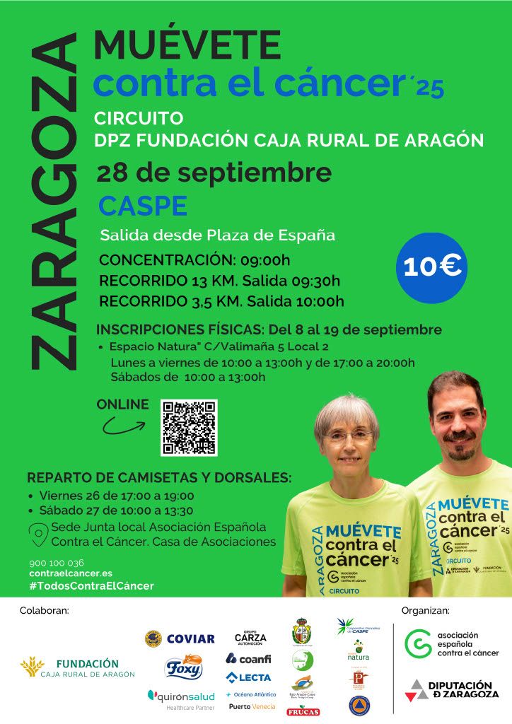 - Muévete contra el Cáncer`25. El domingo 28 de septiembre organizado por AECC y DPZ llega a Caspe el circuito “Muévete contra el cáncer” marcha y andada solidaria con salida de la plaza de España. Actividad con inscripción previa y dos recorridos: 13 km con salida a las 9:30 horas y 3,5 km con salida a las 10:00 horas. Concentración a las 9:00 horas. Inscripciones físicas del 8 al 19 de septiembre en Espacio Natura (C/ Valimaña, 5-local 2) de lunes a viernes de 10:00 a 13:00 horas y de 17:00 a 20:00 horas. Sábados de 10:00 a 13:00 horas y online en QR. Precio inscripción 10€ a favor de AECC. Reparto de camisetas y dorsales en la Sede de AECC de Caspe situada en la Casa de Asociaciones (pza. España) : viernes 26 de septiembre de 17:00 a 19:00 horas y sábado 27 de septiembre de 10:00 a 13:30 horas. Ven a andar, trotar, correr, caminar, pasear, marchar… ¡Lo importante es que vengas!
