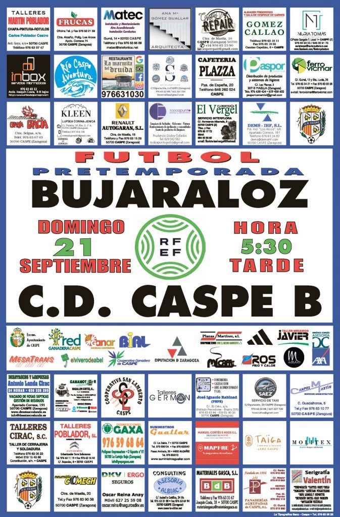 - Fútbol partido de pretemporada CD. Caspe B – Bujaraloz. Domingo 21 de septiembre, a las 17:30 horas, en el Campo de Fútbol Rosales.