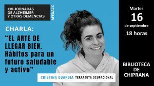- 2ª Jornada Alzheimer organiza AFEDACC Caspe. El martes 16 de septiembre. 18:00 horas en la Biblioteca de Chiprana (planta baja del ayuntamiento). Cristina Guardia, terapeuta ocupacional, impartirá la charla “El arte de llegar bien, hábitos para un futuro saludable y activo”.