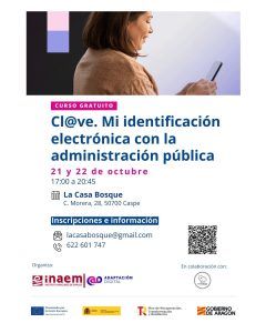 - Cl@ve: Mi identificación electrónica con la Administración Pública. Fecha: martes 21 y miércoles 22 de octubre -Horario: 17:00 a 20:45 h. Fecha límite de inscripción: 14 de octubre. Inscripción: <INSCRIPCIÓN>