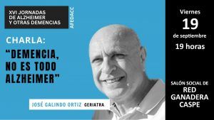 - 3ª Jornada Alzheimer. organiza AFEDACC Caspe El viernes 19 de septiembre. 19:00 horas en el Salón social de Red Ganadera Caspe. El José Galindo Ortiz, geriatra, nos vendrá hablar de que “Demencia, no es todo Alzheimer”.