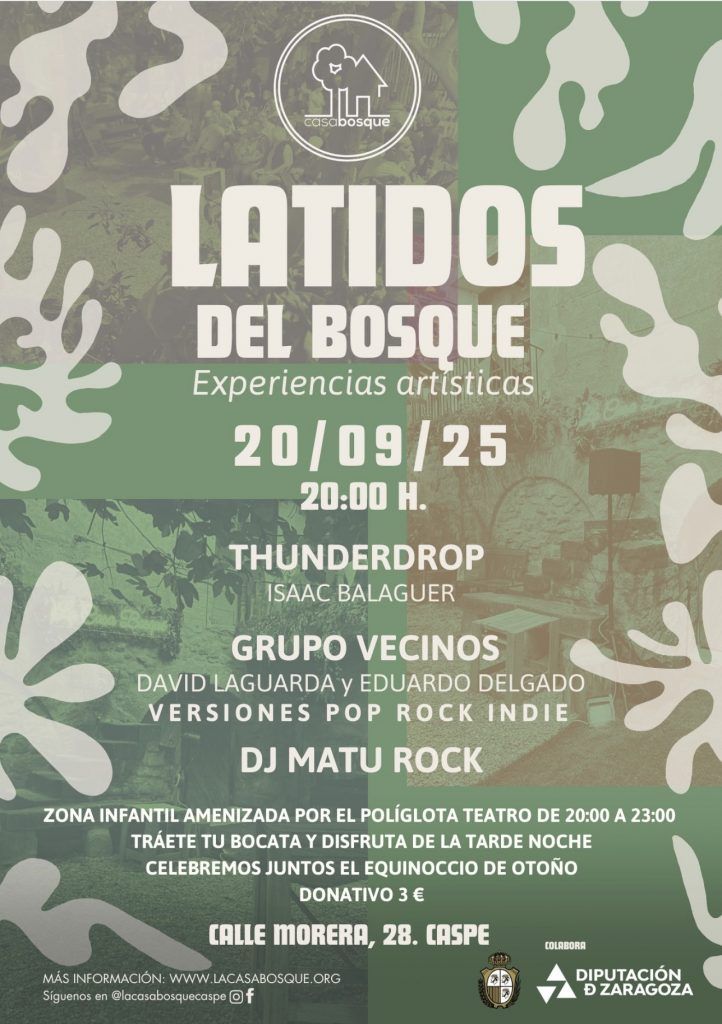 - Latidos del Bosque. El sábado 20 de septiembre. 20:00 horas en la Casa Bosque (C/Morera, 28). Experiencias artísticas a cargo de: