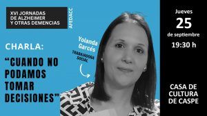 - 5ª Jornada Alzheimer organiza AFEDACC Caspe. Terminando las jornadas de este año 2025, el jueves 25 de septiembre. 19:30 horas. Salón de actos de la Casa de Cultura de Caspe. La trabajadora social y Coordinadora en la Asociación Alzheimer Bajo Aragón Los Calatravos, Yolanda Garcés, nos ofrece la charla “Cuando no podamos tomar decisiones”, explicara la importancia de decidir cuándo podemos, y que se hagan nuestras voluntades.