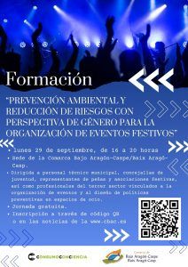- Formación gratuita en Comarca Bajo Aragón-Caspe / Baix Aragó-Casp. El lunes 29 de septiembre. Horario de 16:00 a 20:00 horas en la Sede de la Comarca Bajo Aragón-Caspe / Baix Aragó-Casp. Formación gratuita de “Prevención ambiental y reducción de riesgos con perspectiva de género para la organización de eventos festivos”. Esta jornada está dirigida a: