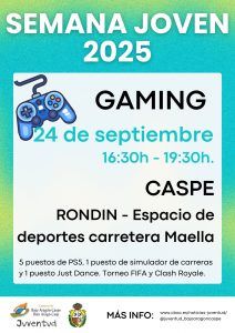 - Semana Joven 2025. El miércoles 24 de septiembre. 16:30 a 19:30 horas en Espacio de Deportes situado en la carretera de Maella (edificio Rondín). Actividad gratuita para jóvenes entre 12 y 17 años (ESO/Bachillerato/FP). Sin inscripción previa. Organizada en Caspe por área de Juventud de la Comarca Bajo Aragón Caspe. Actividad GAMING, encontrarás: 5 puestos de PS5, 1 puesto de Simulador de Carreras, 1 puesto de Just Dance. Torneo FIFA y Clash Royale.
