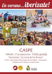 - “Iberízate” Visita guiada yacimiento de la Loma de los Brunos. El sábado 27 de septiembre. 11:00 horas salida desde la plaza Aragón. Organiza el Consorcio de Patrimonio Ibérico de Aragón y el Ayuntamiento de Caspe. El desplazamiento se realizará en coche propio.