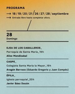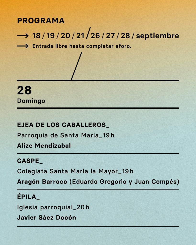 - XLIII Jornadas de Órgano en la provincia. El domingo 28 de septiembre, organizadas por la Diputación Provincial de Zaragoza, llega Caspe la actividad XLIII Jornadas de Órgano en la provincia. A las 19:00 horas en la Colegiata Santa María La Mayor concierto “Aragón Barroco” a cargo de Eduardo Gregario y Juan Compés. Entrada libre hasta completar aforo.