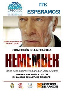 - Actividades. El viernes 8 de mayo a las 20:00 horas en el Salón de Actos de la Casa de Cultura de Caspe nos ofrecen la proyección de la película “Remember“. Actividad gratuita hasta completar aforo.