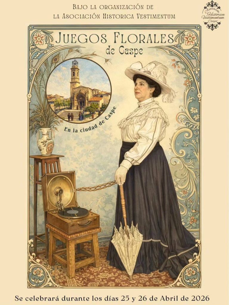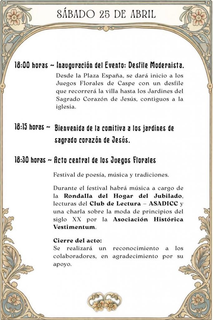 - Juegos Florales de Caspe. Los días 25 y 26 de abril organizado por la Asociación Historica Vestimentum. Festival de poesía, música y tradiciones.