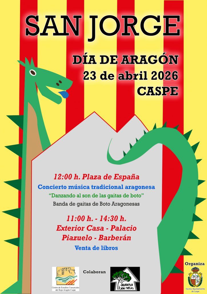 - Caspe, Música y libros para celebrar el 23 de abril, San Jorge (Día de Aragón y Día del Libro). El jueves 23 de abril en la plaza de España organiza el Ayuntamiento de Caspe.