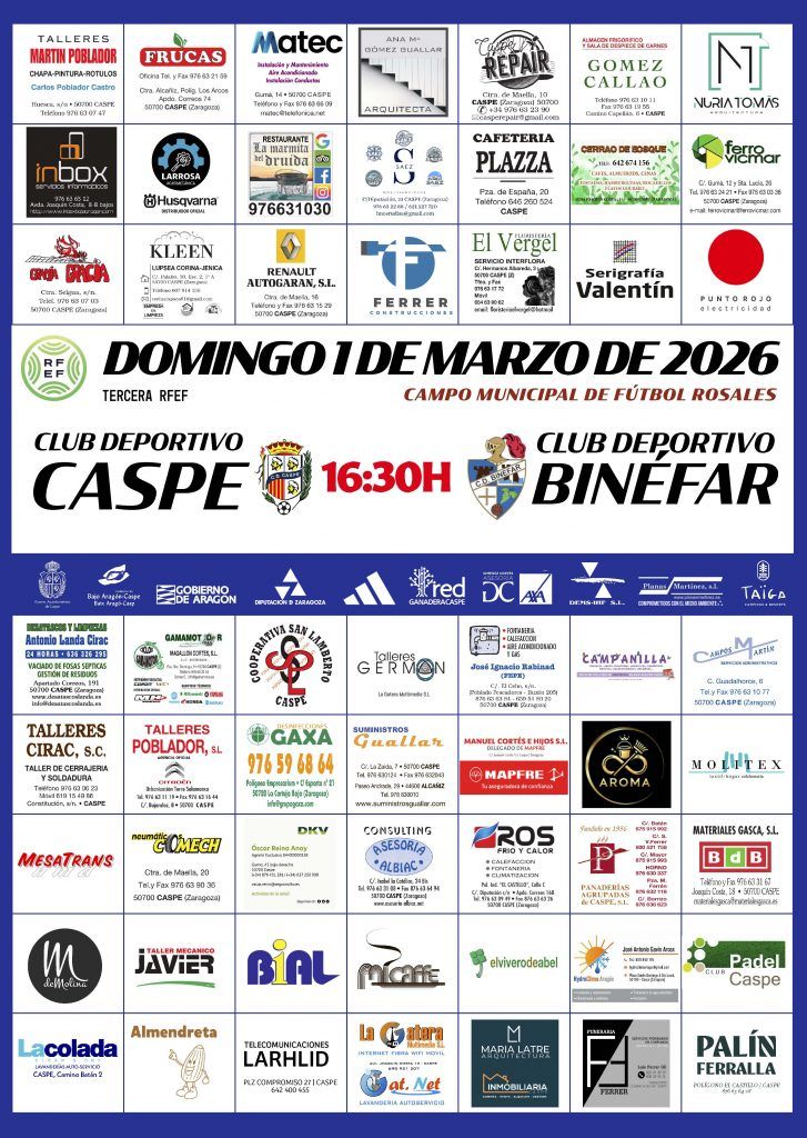 - Fútbol C.D. Caspe. El domingo 1 de marzo a las 16:30 horas en el Campo Municipal de Fútbol Rosales. Tercera RFEF. D. Caspe – C. D. Binefar