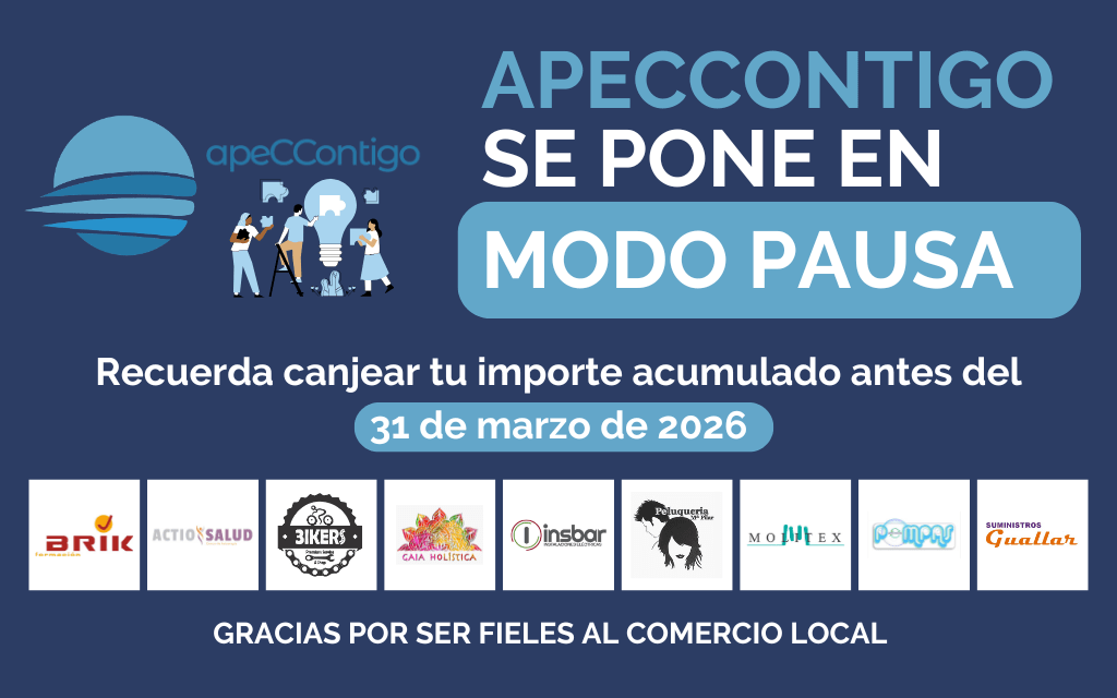 - Programa de fidelización ApeCContigo. APEC Comunica que el programa de fidelización ApeCContigo se desactiva temporalmente. Tras casi tres años en marcha, se abre un periodo para que los clientes puedan gastar su saldo acumulado, ya que a partir del 1 de abril dejará de estar operativo. Establecimientos adheridos donde canjearlo: Academia Brik, Actio Salud, Bikers, Gaia Holística, Insbar, Peluquería Mª Pilar, Molitex, Pompas y Suministros Guallar. Puedes canjear tus saldos hasta el 31 de marzo. Gracias por ser fieles al comercio local.