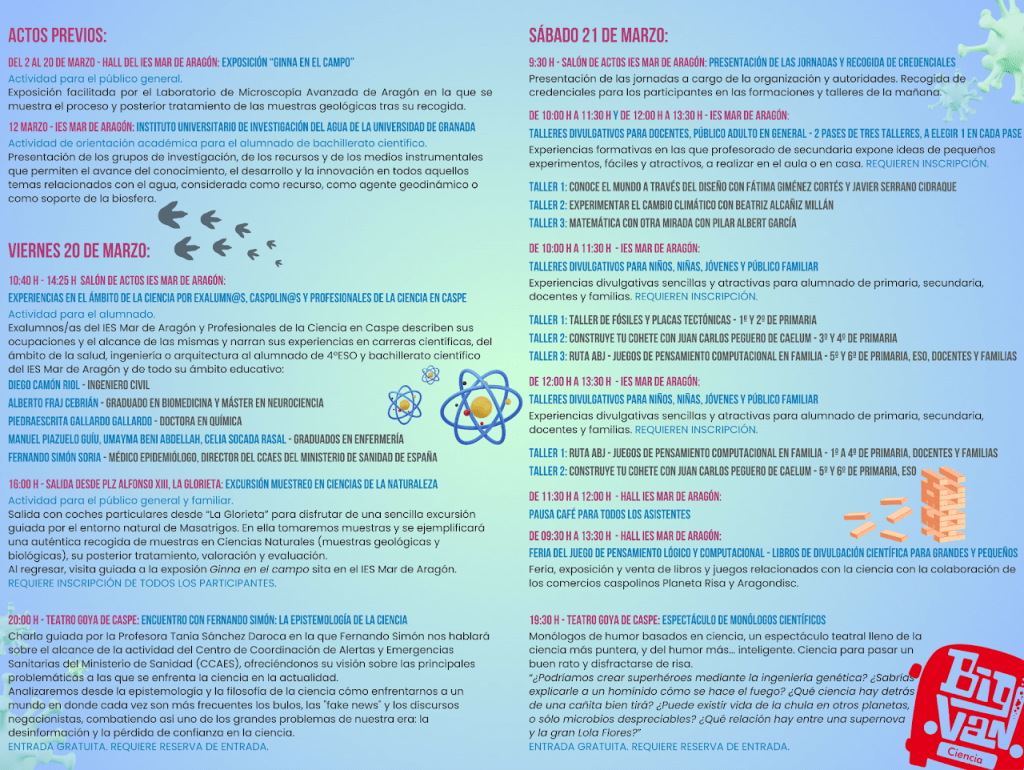 - II Jornadas de Divulgación Científica. Caspe, con de Ciencia. Los días 20 y 21 de marzo. El Equipo de Ciencia del IES Mar de Aragón se complace en presentar las II Jornadas de Divulgación Científica de nuestra localidad: Caspe, con C de Ciencia. Una cita imprescindible para el próximo mes de marzo. Los días 20 y 21 de marzo llegan llenos de múltiples y variadas propuestas abiertas al público en general: – Ponencias de exalumn@s, caspolin@s y profesionales de la ciencia en Caspe: ¡nos visitará Fernando Simón! – Talleres en el laboratorio para grandes y pequeños, para docentes y estudiantes… – Espectáculos de humor con Big Van Ciencia para disfractarse de risa – Excursiones con recogida de muestras y expertos de la Universidad de Wyoming. ¡Y habrá más sorpresas! Desde el Equipo de Ciencia del IES Mar de Aragón agradecen a las entidades que creen en C de Ciencia apoyándolo económicamente sin las cuales las jornadas no serían posible: Excmo. Ayuntamiento de Caspe @caspe_ayuntamiento, a Comarca del Bajo Aragón Caspe-Baix Aragó Casp @comarcabajoaragoncaspe y a sus áreas de Cultura; gracias al Centro de Profesorado María de Ávila del Gobierno de Aragón @cpmariadeavila , y gracias a nuestro querido IES que apoya todas las grandes iniciativas de su magnífico claustro. Mañana, martes 17 de febrero, a las 17:00 h.: ¡apertura de inscripciones y reserva de entradas! ¡¡Descubre su programa visitando su web!! https://sites.google.com/iesmardearagon.es/caspeconcdeciencia/qu%C3%A9-haremos