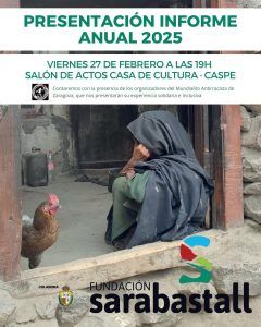 - Fundación Sarabastall. El viernes 27 de febrero a las 19:00 horas en el salón de actos de la Casa de Cultura de Caspe tendrá lugar la presentación del nuevo Informe Anual 2025 de la Fundación Sarabastall. Un acto sencillo, pero lleno de significado, donde además se compartirán: