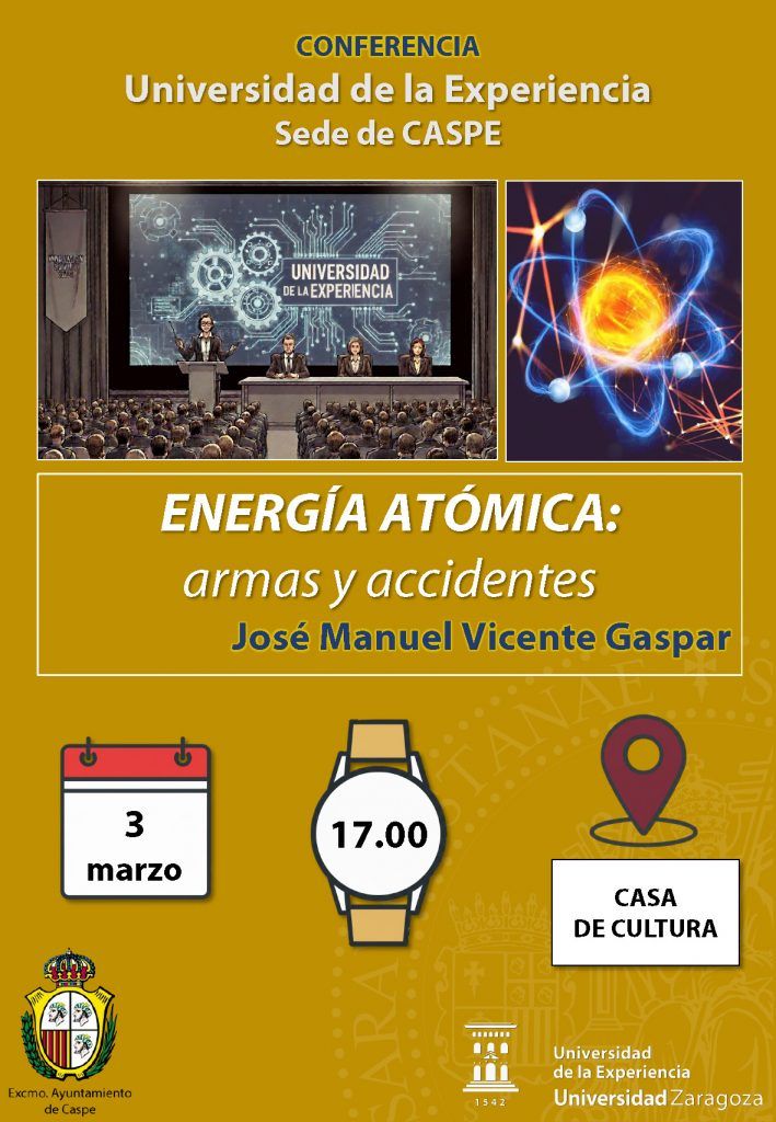 - Conferencia UEZ. “Energía atómica: armas y accidentes”. El martes 3 de febrero a las 17:00 horas en el Salón de Actos de la Casa de Cultura de Caspe. El Área de Educación del Ayuntamiento de Caspe, dentro del marco de la Universidad de la Experiencia -UEZ- de Caspe, ofrece la conferencia que lleva por título “Energía atómica: armas y accidentes” impartida por José Manuel Vicente Gaspar, profesor del Centro Universitario de la Defensa de la Universidad de Zaragoza.