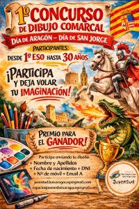 - I Concurso Comarcal de Dibujo “Día de Aragón – San Jorge 2026”. El Área de Juventud de la Comarca Bajo Aragón-Caspe / Baix Aragó-Casp nos informa de la convocatoria del I Concurso Comarcal de Dibujo “Día de Aragón – San Jorge 2026”, una iniciativa dirigida a fomentar la creatividad artística y la participación juvenil con motivo de la celebración del Día de Aragón, el próximo 23 de abril. El concurso está destinado a jóvenes nacidos entre 1996 y 2013 con vinculación con la comarca, quienes podrán presentar hasta dos dibujos relacionados con la temática del Día de Aragón, San Jorge, la leyenda del dragón o elementos culturales aragoneses. El plazo de presentación de trabajos estará abierto desde el 19 de marzo hasta el 17 de abril de 2026 a las 14:00 horas.