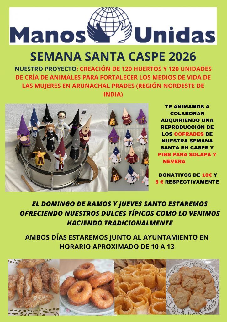 - Manos Unidas en Semana Santa Caspe 2026: El 29 de marzo, Domingo de Ramos y el 2 de abril, Jueves Santo, de 10:00 a 13:00 horas junto al Ayuntamiento, Manos Unidas ofrecerá dulces tradicionales y reproducciones artesanales de cofrades y pins solidarios. La recaudación se destinará al proyecto ‘Creación de 120 huertos y 120 unidades de cría de animales para fortalecer los medios de vida de las mujeres en Arunachal Prades (región nordeste de India).
