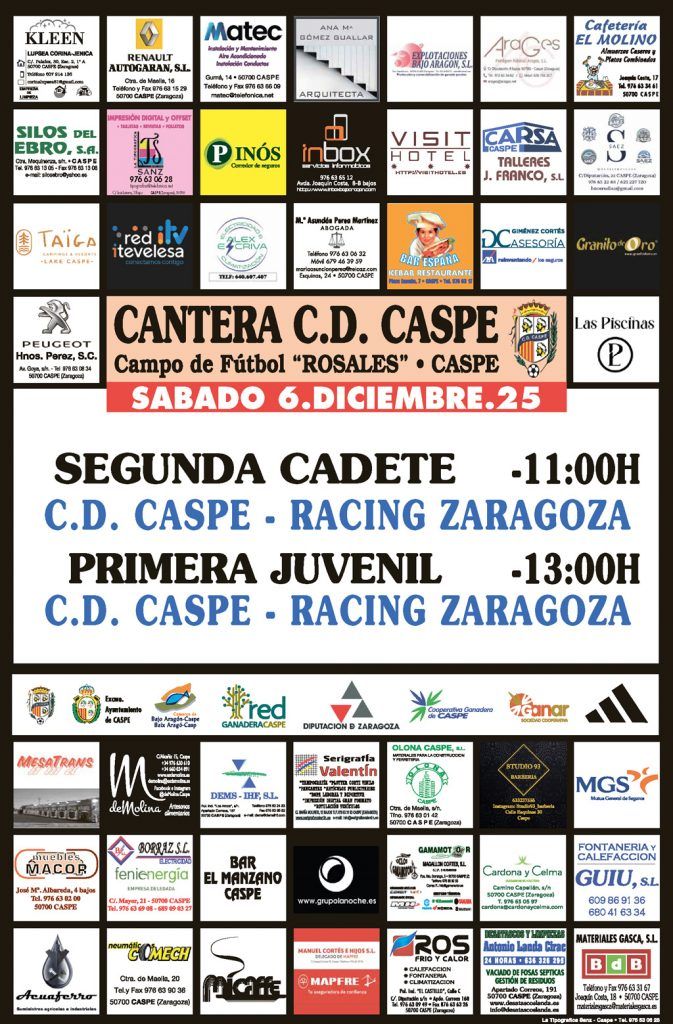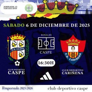 - Fútbol C.D. Caspe. El sábado 6 de diciembre a las 16:30 horas, en el Campo Municipal de Fútbol Rosales, C.D. Caspe – C.D. Cariñena.