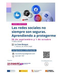 - Cursos gratuitos de Formación en Casa Bosque. La Casa Bosque abre las puertas de su coworking para llenarlo con esta formación, organizada por el INAEM, y en la que la asociación colabora con para ofrecer conocimientos digitales de forma sencilla, práctica y de forma gratuita a la ciudadanía de Caspe. Cada curso se realiza sólo en dos tardes y se pueden hacer con el propio teléfono móvil personal, de forma que se pueda aplicar directamente a la vida diaria el contenido y las prácticas de los cursos. A continuación, detallamos la información de los próximos cursos programados: