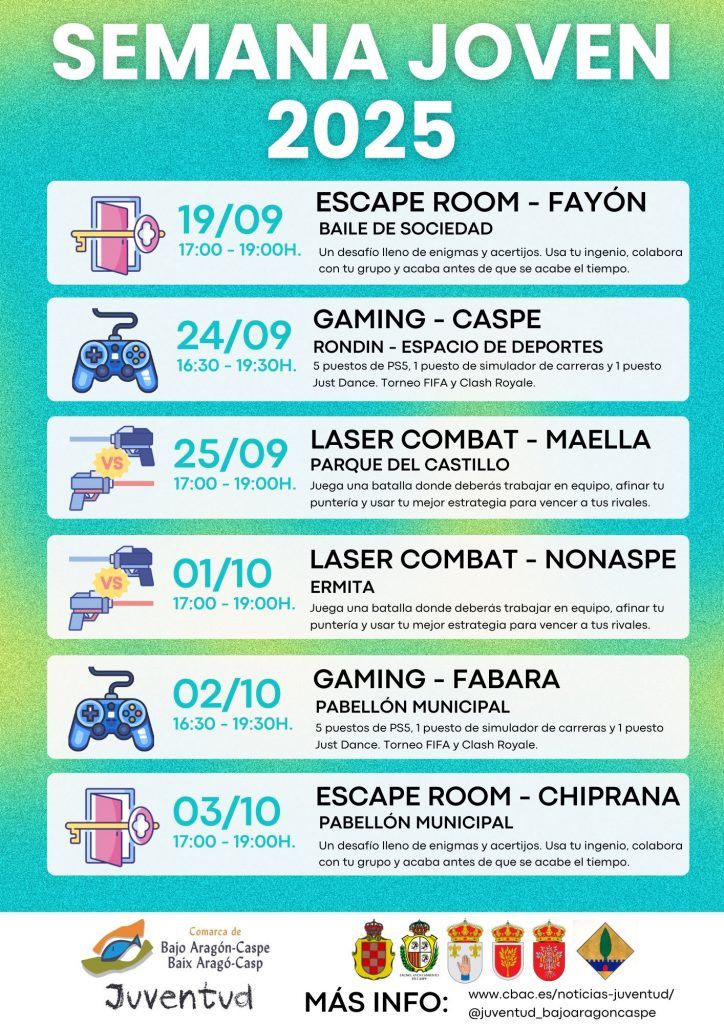 - Semana Joven 2025 en Caspe. La Semana Joven 2025 se celebra del 19 de septiembre al 3 de octubre, organizada por área de Juventud de la Comarca Bajo Aragón Caspe. Diversión, juegos y mucha acción para los jóvenes de la comarca. La Semana Joven 2025 llega al Bajo Aragón-Caspe con un programa lleno de actividades pensadas para que los jóvenes de la comarca vivan experiencias únicas, se diviertan y compartan buenos momentos con sus amigos. Otras fechas clave:
