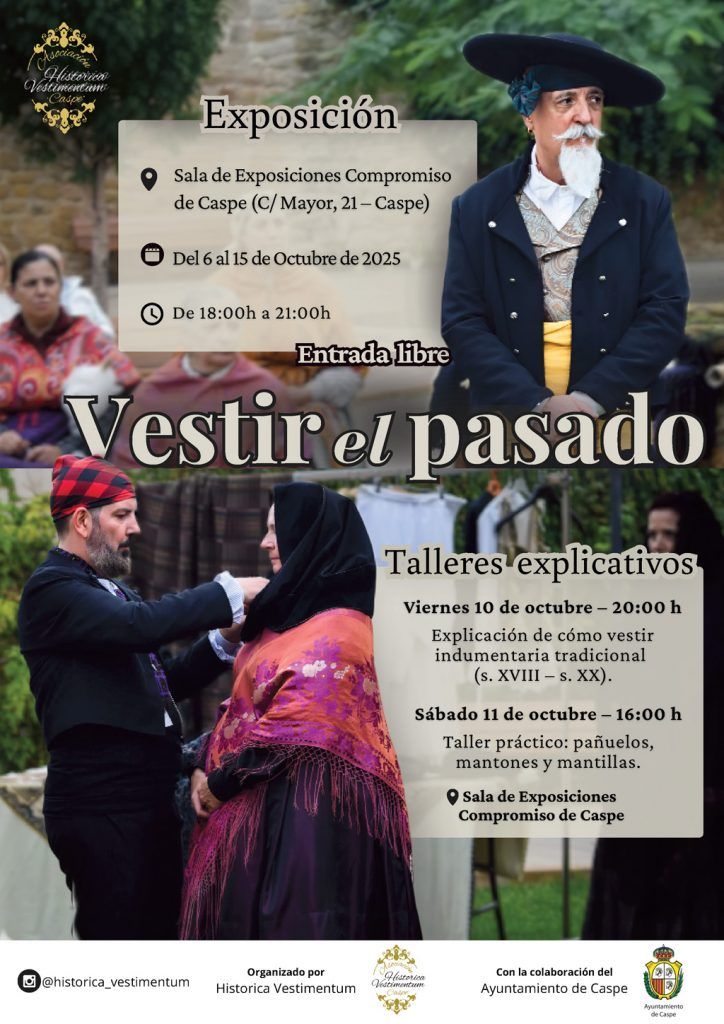 - Exposición “Vestir el pasado”. Desde el 6 al 25 de octubre en la Sala de Exposiciones “Compromiso de Caspe” en horario de 18:00 a 21:00 horas. Inauguración el lunes 6 de octubre a las 20:00 horas.