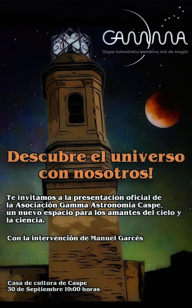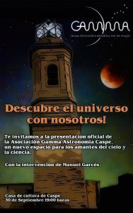 - Presentación Asociación Gamma Astronomía Caspe. El martes 30 de septiembre. 19:00 horas en el Salón de Actos de la Casa de Cultura. Presentación oficial de la Asociación Gamma Astronomía Caspe, nueva asociación para amantes del cielo y la ciencia. Interviene en el acto Manuel Garcés.