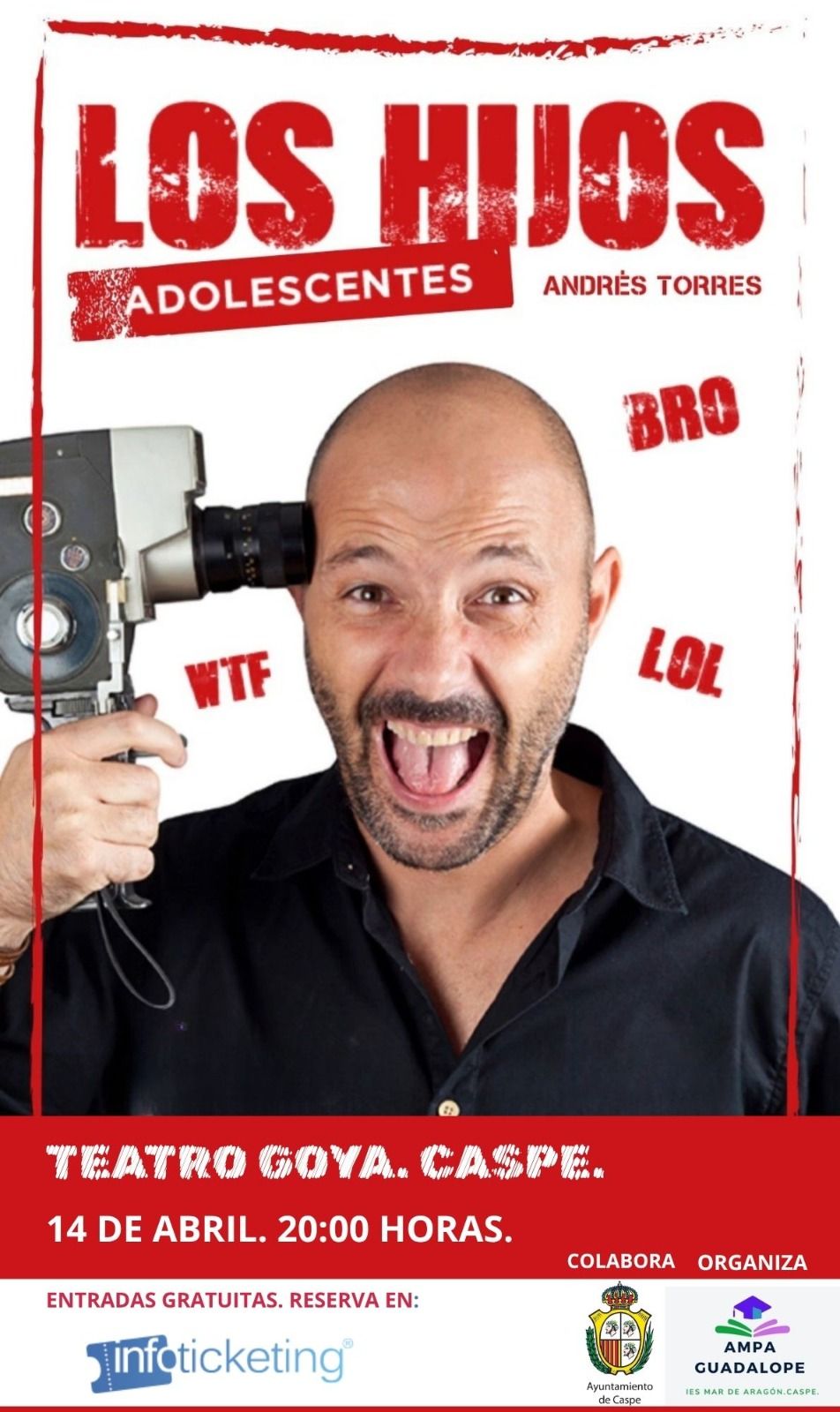 • I edición Jornadas “Adolescencia en positivo”. El martes 14 de abril se celebra la primera actividad consistente en la comedia familiar de monólogos sobre adolescencia “Los hijos adolescentes” a cargo de Andrés Torres, próximo martes 14 de abril a las 20:00 horas en el Teatro Goya. https://caspe.sacatuentrada.es/es/entradas/los-hijos-adolescentes