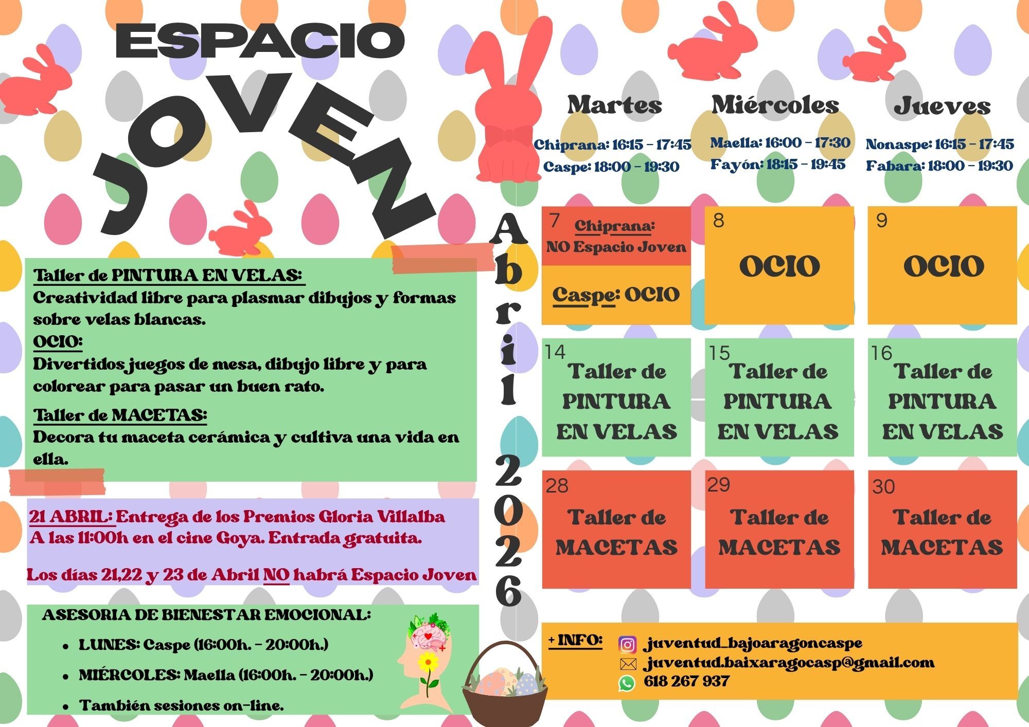 • ¡Abril llega cargado de actividades en el ESPACIO JOVEN! Si te apetece crear, jugar, desconectar o simplemente pasar un buen rato… ¡este mes lo tienes todo! Caspe 7, 14 y 28 abril.